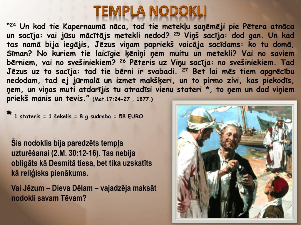 TEMPĻA NODOKĻI “24 Un kad tie Kapernaumā nāca, tad tie metekļu saņēmēji pie Pētera atnāca un sacīja: vai jūsu mācītājs metekli nedod? 25 Viņš sacīja: dod gan. Un kad tas namā bija iegājis, Jēzus viņam papriekš vaicāja sacīdams: ko tu domā, Sīman? No kuriem tie laicīgie ķēniņi ņem muitu un metekli? Vai no saviem bērniem, vai no svešiniekiem? 26 Pēteris uz Viņu sacīja: no svešiniekiem. Tad Jēzus uz to sacīja: tad tie bērni ir svabadi. 27 Bet lai mēs tiem apgrēcību nedodam, tad ej jūrmalā un izmet makšķeri, un to pirmo zivi, kas piekodīs, ņem, un viņas muti atdarījis tu atradīsi vienu stateri *, to ņem un dod viņiem priekš manis un tevis.” (Mat.17:24-27 , 1877.) * 1 stateris = 1 šekelis = 8 g sudraba = 58 EURO Šis nodoklis bija paredzēts tempļa uzturēšanai (2.M. 30:12-16). Tas nebija obligāts kā Desmitā tiesa, bet tika uzskatīts kā reliģisks pienākums. Vai Jēzum – Dieva Dēlam – vajadzēja maksāt nodokli savam Tēvam?