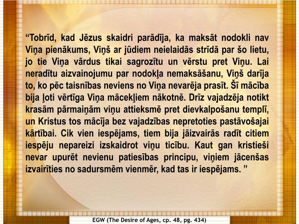 “Tobrīd, kad Jēzus skaidri parādīja, ka maksāt nodokli nav Viņa pienākums, Viņš ar jūdiem neielaidās strīdā par šo lietu, jo tie Viņa vārdus tikai sagrozītu un vērstu pret Viņu. Lai neradītu aizvainojumu par nodokļa nemaksāšanu, Viņš darīja to, ko pēc taisnības neviens no Viņa nevarēja prasīt. Šī mācība bija ļoti vērtīga Viņa mācekļiem nākotnē. Drīz vajadzēja notikt krasām pārmaiņām viņu attieksmē pret dievkalpošanu templī, un Kristus tos mācīja bez vajadzības nepretoties pastāvošajai kārtībai. Cik vien iespējams, tiem bija jāizvairās radīt citiem iespēju nepareizi izskaidrot viņu ticību. Kaut gan kristieši nevar upurēt nevienu patiesības principu, viņiem jācenšas izvairīties no sadursmēm vienmēr, kad tas ir iespējams. ” EGW (The Desire of Ages, cp. 48, pg. 434)