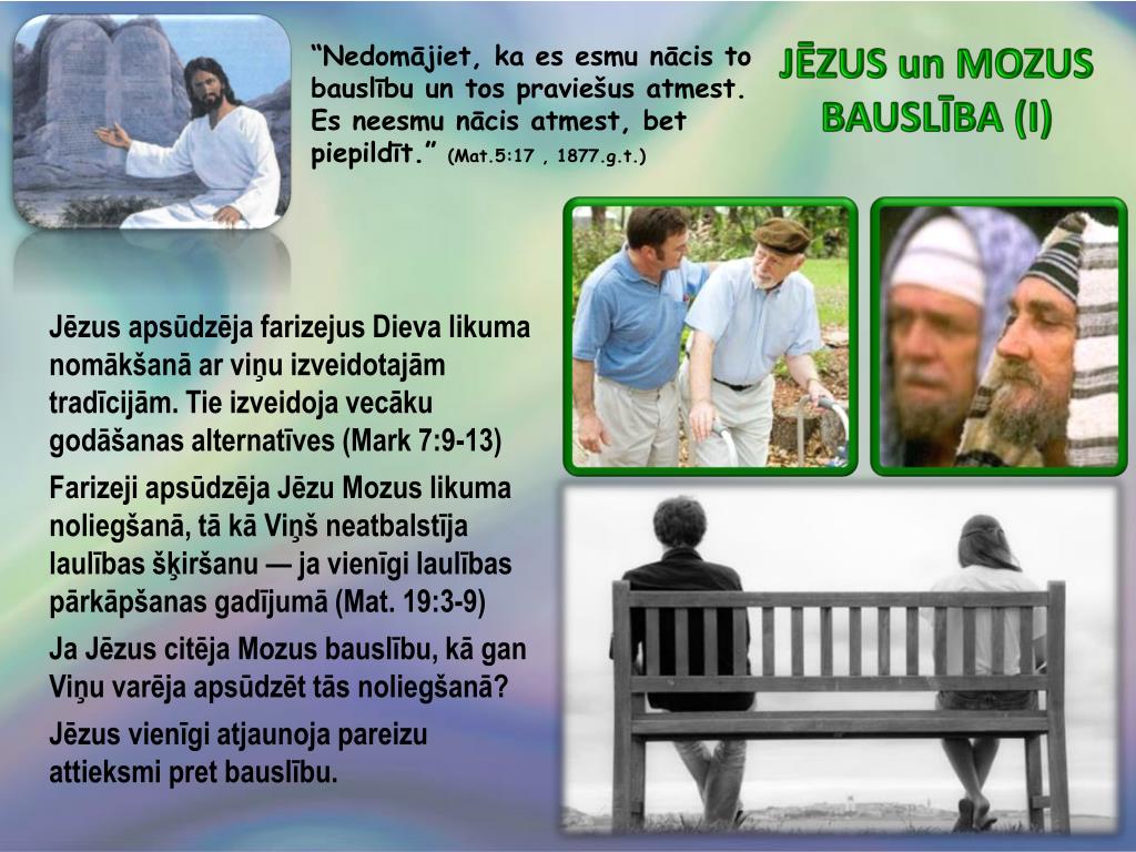 JĒZUS un MOZUS BAUSLĪBA (I) “Nedomājiet, ka es esmu nācis to bauslību un tos praviešus atmest. Es neesmu nācis atmest, bet piepildīt.” (Mat.5:17 , 1877.g.t.) Jēzus apsūdzēja farizejus Dieva likuma nomākšanā ar viņu izveidotajām tradīcijām. Tie izveidoja vecāku godāšanas alternatīves (Mark 7:9-13) Farizeji apsūdzēja Jēzu Mozus likuma noliegšanā, tā kā Viņš neatbalstīja laulības šķiršanu — ja vienīgi laulības pārkāpšanas gadījumā (Mat. 19:3-9) Ja Jēzus citēja Mozus bauslību, kā gan Viņu varēja apsūdzēt tās noliegšanā? Jēzus vienīgi atjaunoja pareizu attieksmi pret bauslību.
