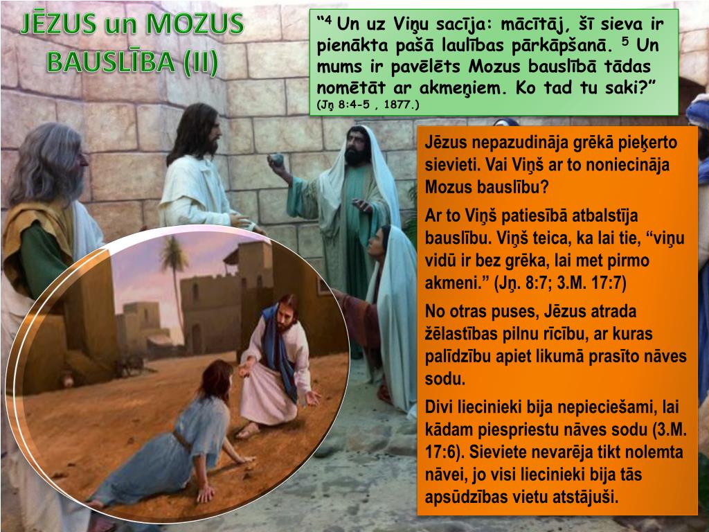 JĒZUS un MOZUS BAUSLĪBA (II) “4 Un uz Viņu sacīja: mācītāj, šī sieva ir pienākta pašā laulības pārkāpšanā. 5 Un mums ir pavēlēts Mozus bauslībā tādas nomētāt ar akmeņiem. Ko tad tu saki?” (Jņ 8:4-5 , 1877.) Jēzus nepazudināja grēkā pieķerto sievieti. Vai Viņš ar to noniecināja Mozus bauslību? Ar to Viņš patiesībā atbalstīja bauslību. Viņš teica, ka lai tie, “viņu vidū ir bez grēka, lai met pirmo akmeni.” (Jņ. 8:7; 3.M. 17:7) No otras puses, Jēzus atrada žēlastības pilnu rīcību, ar kuras palīdzību apiet likumā prasīto nāves sodu. Divi liecinieki bija nepieciešami, lai kādam piespriestu nāves sodu (3.M. 17:6). Sieviete nevarēja tikt nolemta nāvei, jo visi liecinieki bija tās apsūdzības vietu atstājuši.
