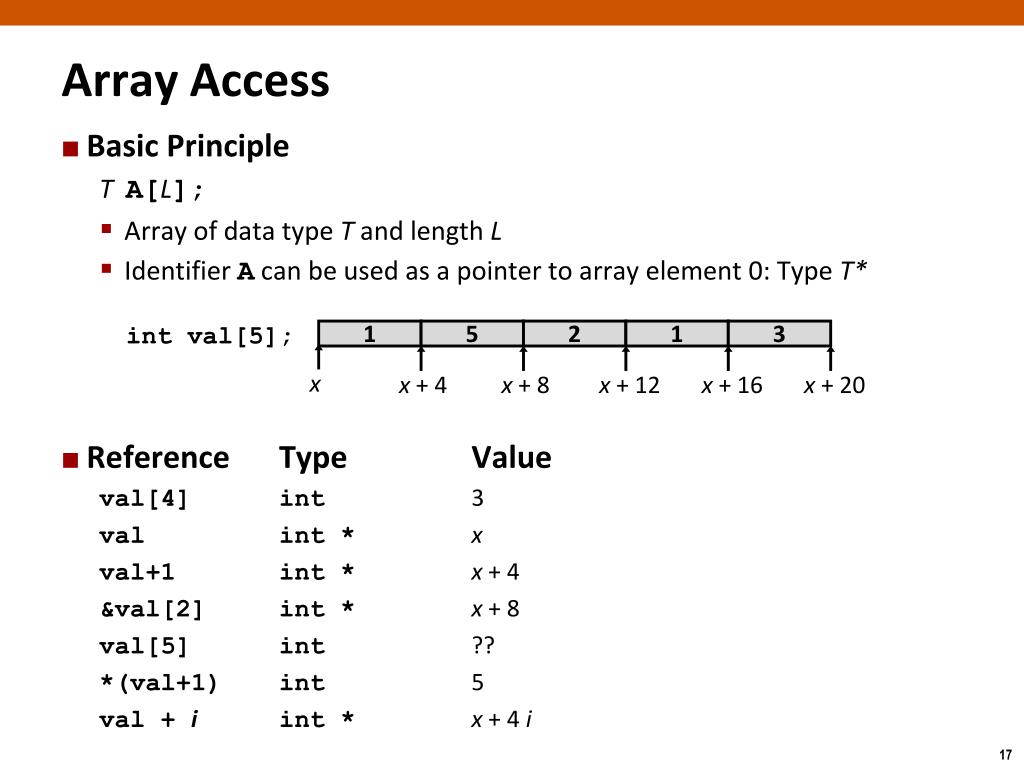 1 5 2 1 3 Array Access • Basic Principle TA[L]; • Array of data type T and length L • Identifier A can be used as a pointer to array element 0: Type T* • Reference Type Value val[4] int3 valint * x val+1int * x + 4 &val[2]int * x + 8 val[5]int?? *(val+1)int5 val + iint * x + 4i int val[5]; x x + 4 x + 8 x + 12 x + 16 x + 20