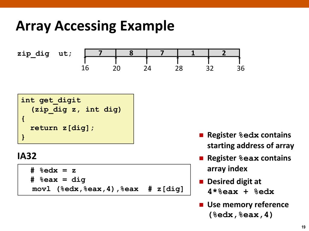 7 8 7 1 2 Array Accessing Example • Register %edx contains starting address of array • Register %eax contains array index • Desired digit at 4*%eax + %edx • Use memory reference (%edx,%eax,4) zip_digut; int get_digit (zip_dig z, int dig) { return z[dig]; } 16 20 24 28 32 36 IA32 # %edx = z # %eax = dig movl (%edx,%eax,4),%eax # z[dig]