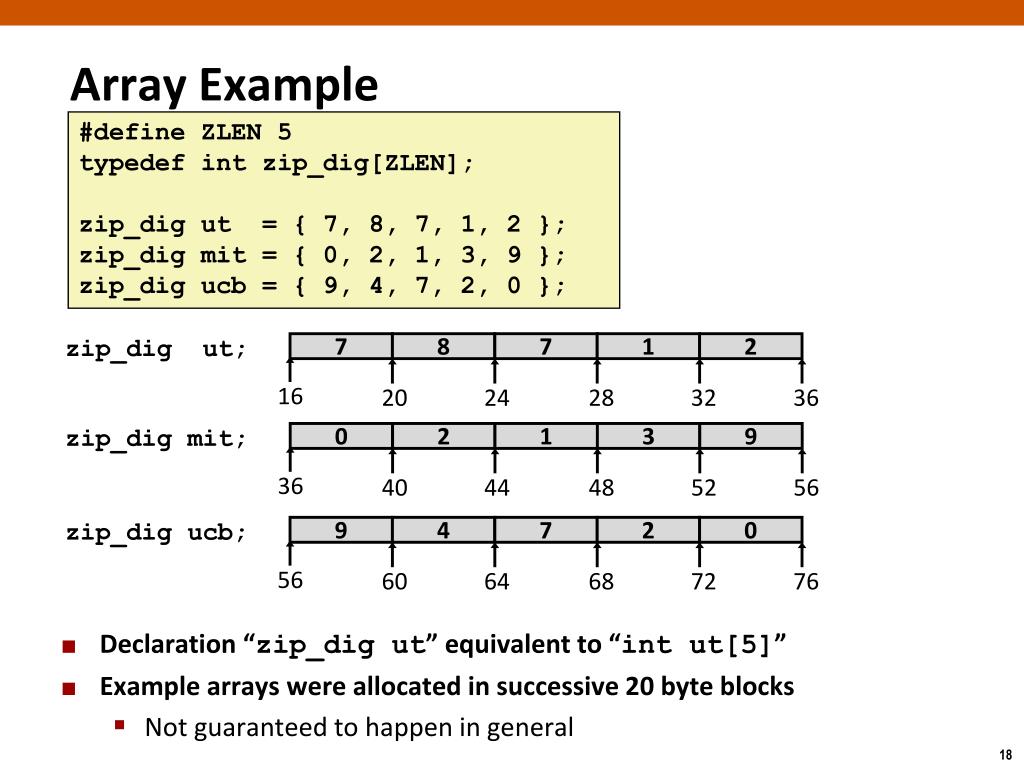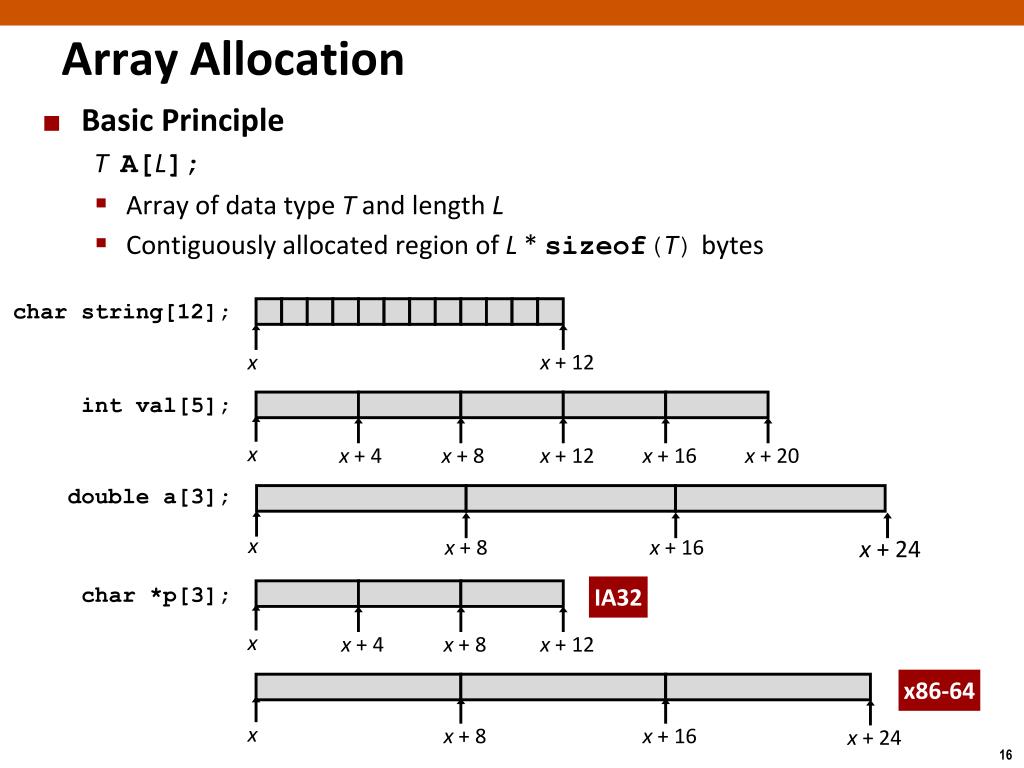 Array Allocation • Basic Principle TA[L]; • Array of data type T and length L • Contiguously allocated region of L * sizeof(T) bytes char string[12]; x x + 12 int val[5]; x x + 4 x + 8 x + 12 x + 16 x + 20 double a[3]; x x + 8 x + 16 x + 24 char *p[3]; IA32 x x + 4 x + 8 x + 12 x86-64 x x + 8 x + 16 x + 24