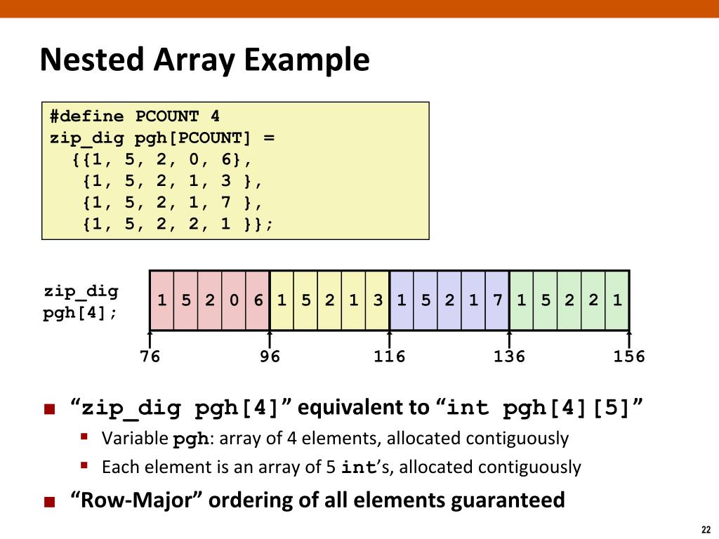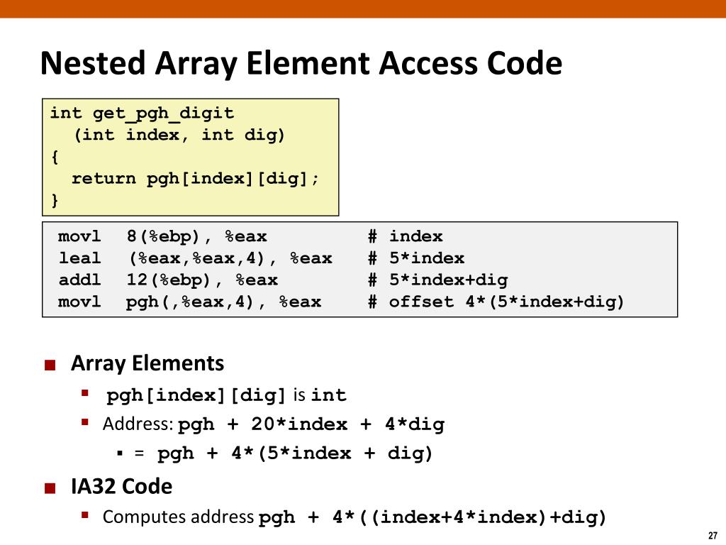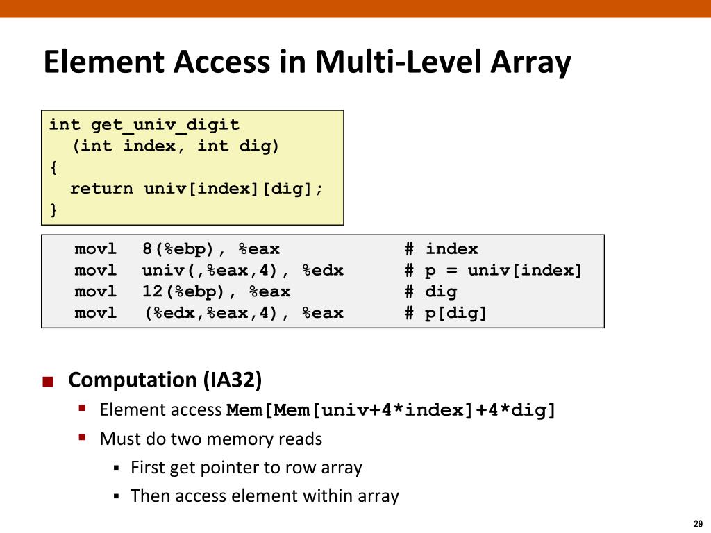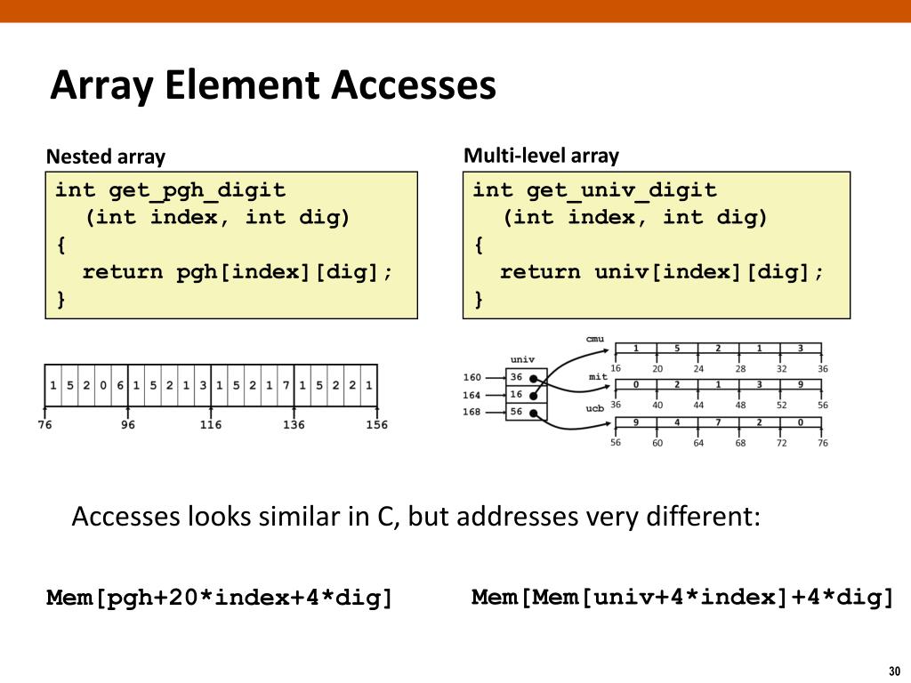Array Element Accesses Multi-level array Nested array int get_pgh_digit (int index, int dig) { return pgh[index][dig]; } int get_univ_digit (int index, int dig) { return univ[index][dig]; } Accesses looks similar in C, but addresses very different: Mem[Mem[univ+4*index]+4*dig] Mem[pgh+20*index+4*dig]