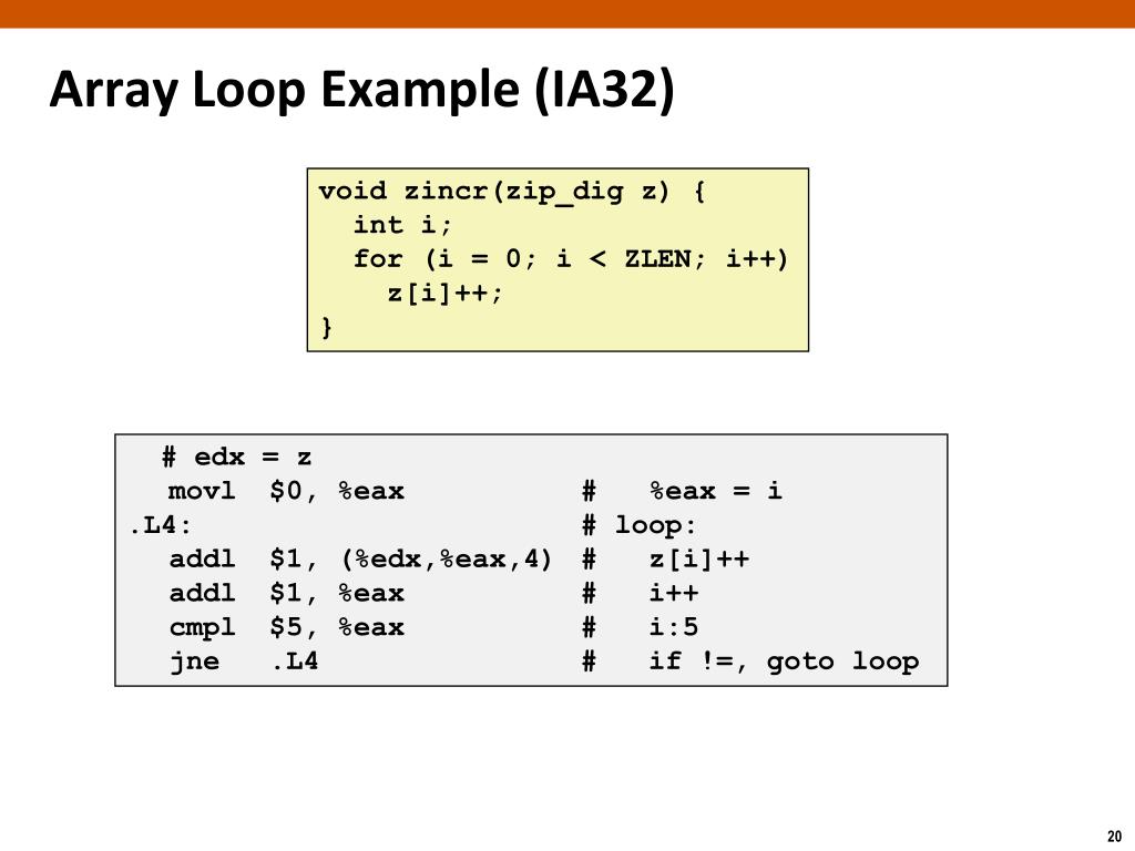 Array Loop Example (IA32) void zincr(zip_dig z) { inti; for (i = 0; i < ZLEN; i++) z[i]++; } # edx = z movl $0, %eax # %eax = i .L4: # loop: addl $1, (%edx,%eax,4) # z[i]++ addl $1, %eax # i++ cmpl $5, %eax # i:5 jne .L4 # if !=, goto loop