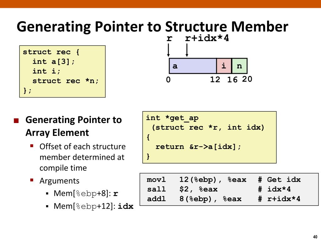 Generating Pointer to Structure Member r r+idx*4 structrec { inta[3]; inti; structrec *n; }; • Generating Pointer to Array Element • Offset of each structure member determined at compile time • Arguments • Mem[%ebp+8]: r • Mem[%ebp+12]: idx a i n 20 12 0 16 int*get_ap (structrec *r, intidx) { return &r->a[idx]; } movl 12(%ebp), %eax # Get idx sall $2, %eax # idx*4 addl 8(%ebp), %eax # r+idx*4