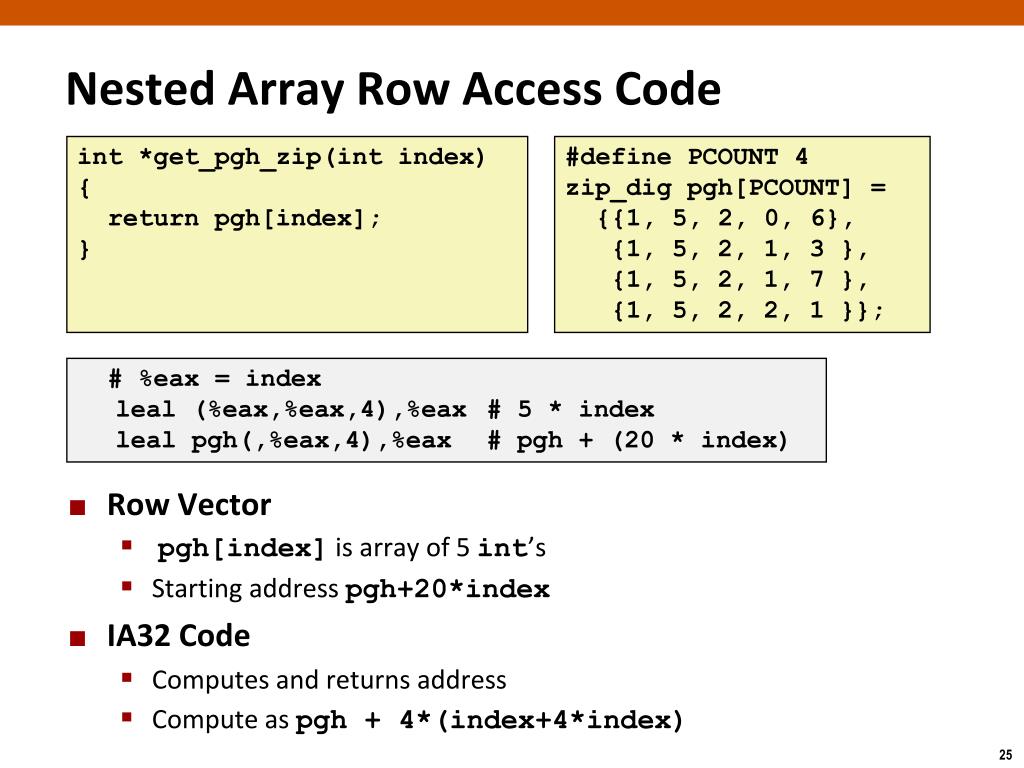 Nested Array Row Access Code int *get_pgh_zip(int index) { return pgh[index]; } #define PCOUNT 4 zip_dig pgh[PCOUNT] = {{1, 5, 2, 0, 6}, {1, 5, 2, 1, 3 }, {1, 5, 2, 1, 7 }, {1, 5, 2, 2, 1 }}; • Row Vector • pgh[index]is array of 5 int’s • Starting address pgh+20*index • IA32 Code • Computes and returns address • Compute as pgh + 4*(index+4*index) # %eax = index leal (%eax,%eax,4),%eax # 5 * index lealpgh(,%eax,4),%eax # pgh + (20 * index)