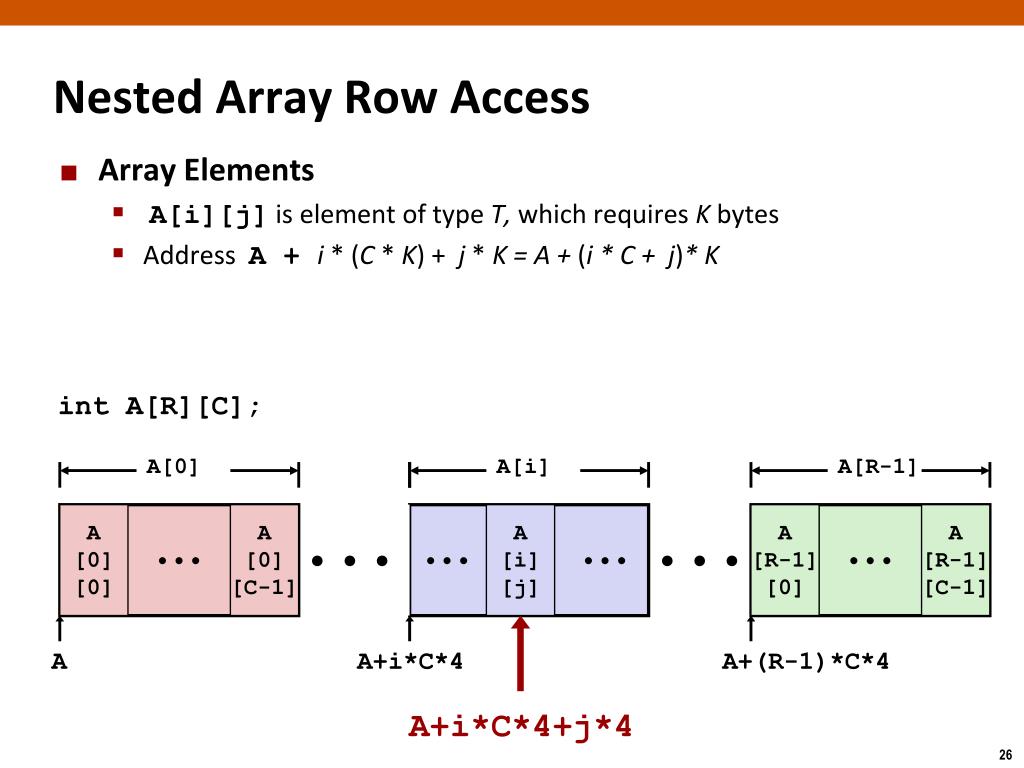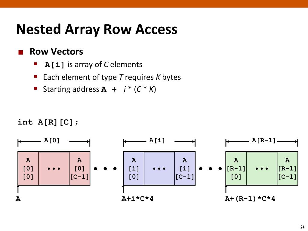A[0] A[i] A[R-1] • • • • • • A [R-1] [0] A [0] [0] • • • A [i] [0] A [0] [C-1] A [R-1] [C-1] A [i] [C-1] Nested Array Row Access • Row Vectors • A[i] is array of C elements • Each element of type T requires K bytes • Starting address A +i * (C * K) int A[R][C]; • • • • • • A+i*C*4 A+(R-1)*C*4 A
