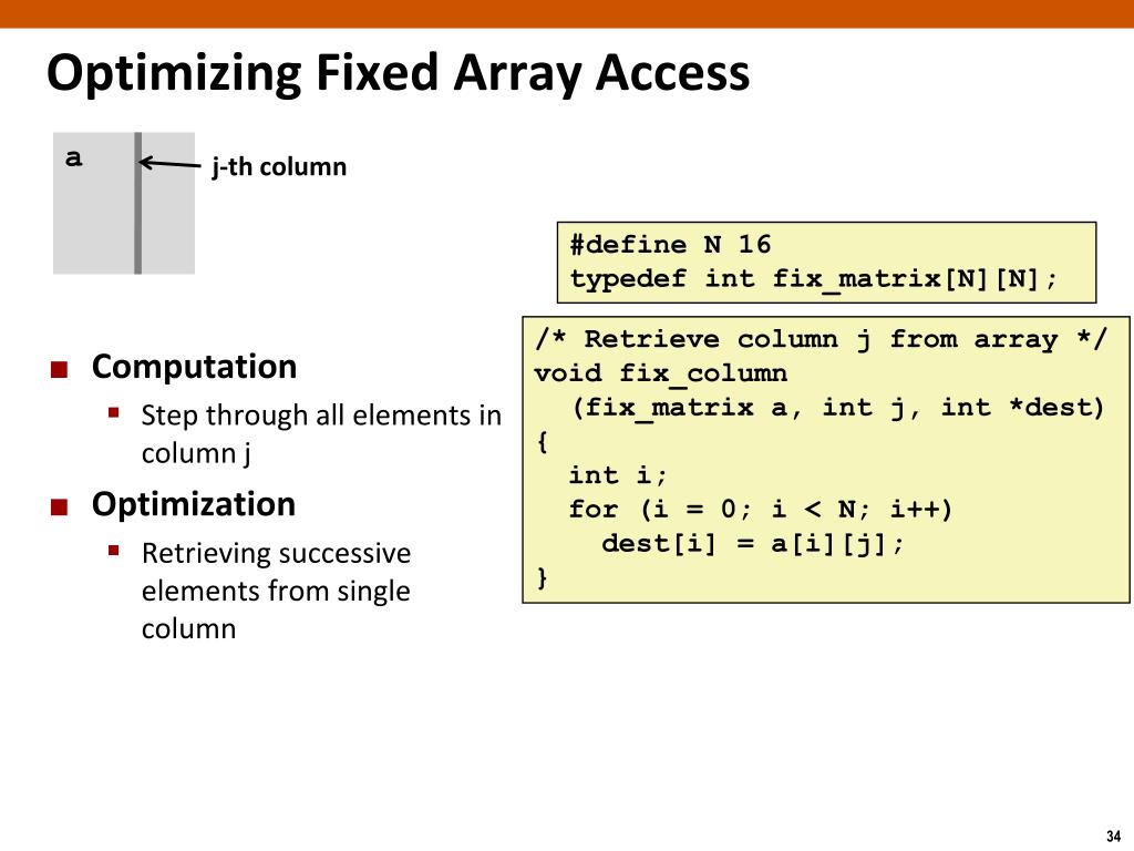Optimizing Fixed Array Access a j-th column • Computation • Step through all elements in column j • Optimization • Retrieving successive elements from single column #define N 16 typedef int fix_matrix[N][N]; /* Retrieve column j from array */ void fix_column (fix_matrix a, int j, int *dest) { inti; for (i = 0; i < N; i++) dest[i] = a[i][j]; }