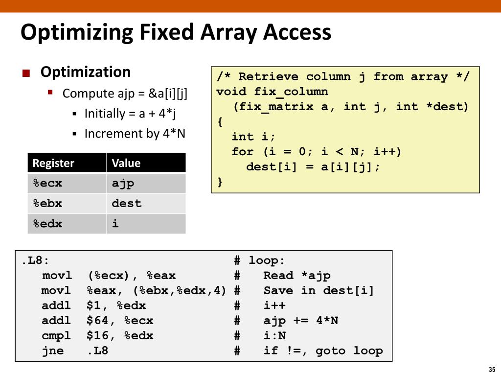 Optimizing Fixed Array Access /* Retrieve column j from array */ void fix_column (fix_matrix a, int j, int *dest) { inti; for (i = 0; i < N; i++) dest[i] = a[i][j]; } • Optimization • Compute ajp = &a[i][j] • Initially = a + 4*j • Increment by 4*N .L8: # loop: movl (%ecx), %eax # Read *ajp movl %eax, (%ebx,%edx,4) # Save in dest[i] addl $1, %edx # i++ addl $64, %ecx # ajp += 4*N cmpl $16, %edx # i:N jne .L8 # if !=, goto loop