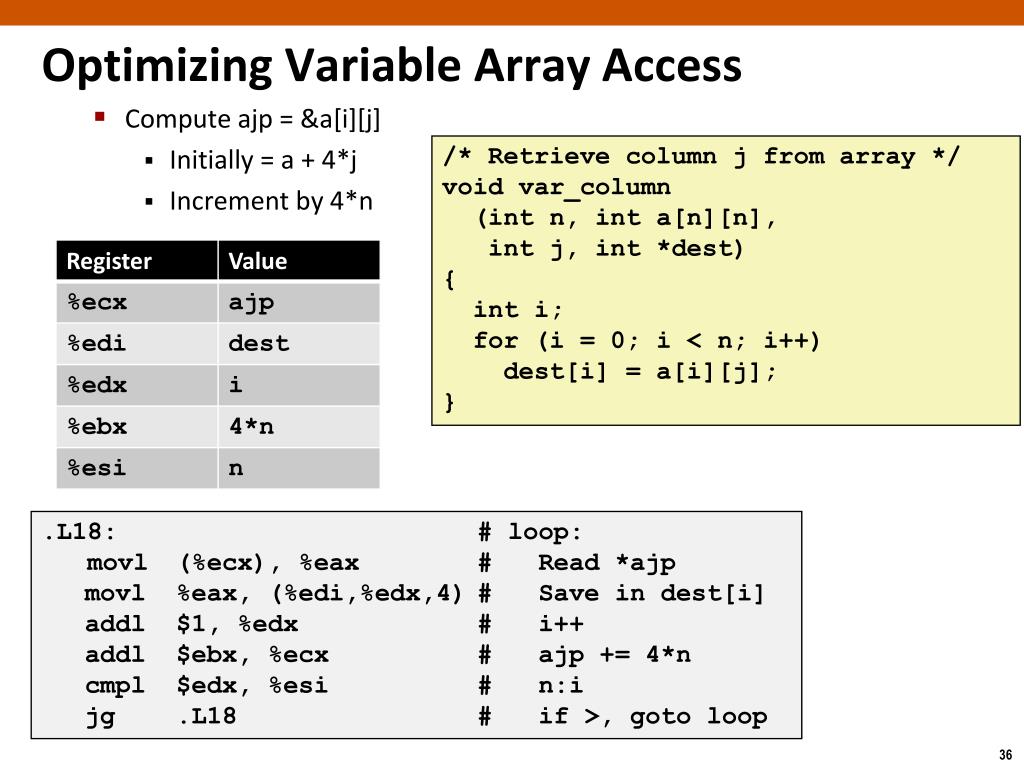 Optimizing Variable Array Access /* Retrieve column j from array */ void var_column (int n, int a[n][n], int j, int *dest) { inti; for (i = 0; i < n; i++) dest[i] = a[i][j]; } • Compute ajp = &a[i][j] • Initially = a + 4*j • Increment by 4*n .L18: # loop: movl (%ecx), %eax # Read *ajp movl %eax, (%edi,%edx,4) # Save in dest[i] addl $1, %edx # i++ addl $ebx, %ecx # ajp += 4*n cmpl $edx, %esi # n:i jg .L18 # if >, goto loop
