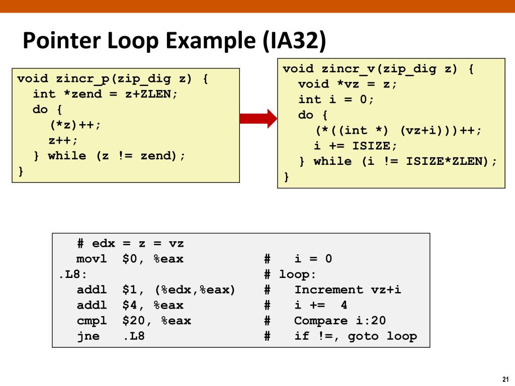 Pointer Loop Example (IA32) void zincr_v(zip_dig z) { void *vz = z; inti = 0; do { (*((int *) (vz+i)))++; i += ISIZE; } while (i != ISIZE*ZLEN); } void zincr_p(zip_dig z) { int *zend = z+ZLEN; do { (*z)++; z++; } while (z != zend); } # edx = z = vz movl $0, %eax # i = 0 .L8: # loop: addl $1, (%edx,%eax) # Increment vz+i addl $4, %eax # i += 4 cmpl $20, %eax # Compare i:20 jne .L8 # if !=, goto loop