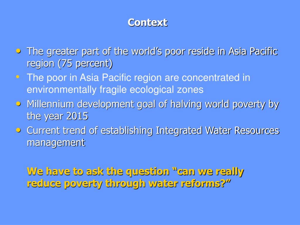 Context • The greater part of the world’s poor reside in Asia Pacific region (75 percent) • The poor in Asia Pacific region are concentrated in environmentally fragile ecological zones • Millennium development goal of halving world poverty by the year 2015 • Current trend of establishing Integrated Water Resources management We have to ask the question “can we really reduce poverty through water reforms?”