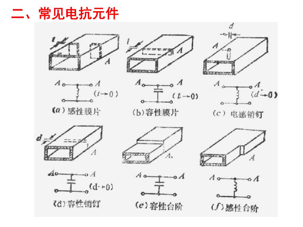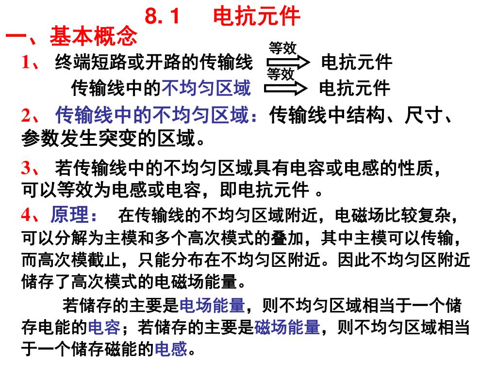等效 传输线中的不均匀区域 电抗元件 8. 1 电抗元件 一、基本概念 等效 1、 终端短路或开路的传输线 电抗元件 2、 传输线中的不均匀区域:传输线中结构、尺寸、参数发生突变的区域。 3、 若传输线中的不均匀区域具有电容或电感的性质,可以等效为电感或电容,即电抗元件 。 4、原理: 在传输线的不均匀区域附近,电磁场比较复杂,可以分解为主模和多个高次模式的叠加,其中主模可以传输,而高次模截止,只能分布在不均匀区附近。因此不均匀区附近储存了高次模式的电磁场能量。 若储存的主要是电场能量,则不均匀区域相当于一个储存电能的电容;若储存的主要是磁场能量,则不均匀区域相当于一个储存磁能的电感。