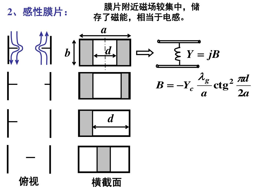 膜片附近磁场较集中,储存了磁能,相当于电感。膜片附近磁场较集中,储存了磁能,相当于电感。 2、感性膜片: a d b d 俯视 横截面