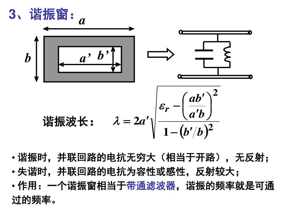 谐振波长: 3、谐振窗: a b’ b a’ • 谐振时,并联回路的电抗无穷大(相当于开路),无反射; • 失谐时,并联回路的电抗为容性或感性,反射较大; • 作用:一个谐振窗相当于带通滤波器,谐振的频率就是可通过的频率。