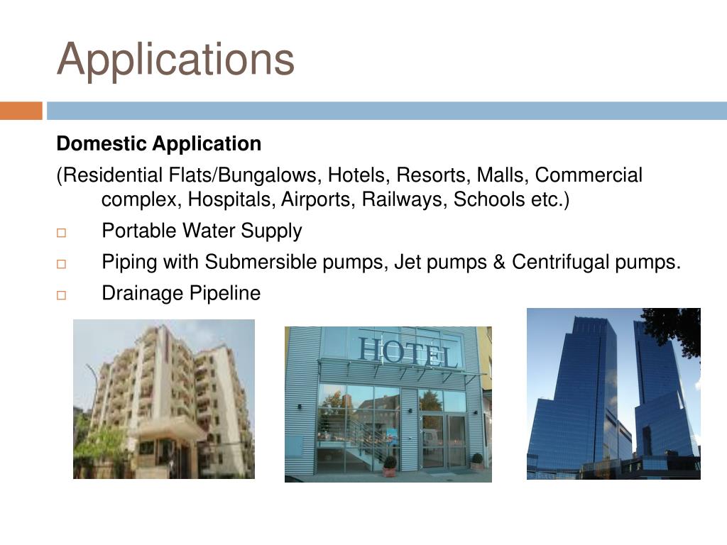 Applications Domestic Application (Residential Flats/Bungalows, Hotels, Resorts, Malls, Commercial complex, Hospitals, Airports, Railways, Schools etc.) • Portable Water Supply • Piping with Submersible pumps, Jet pumps & Centrifugal pumps. • Drainage Pipeline