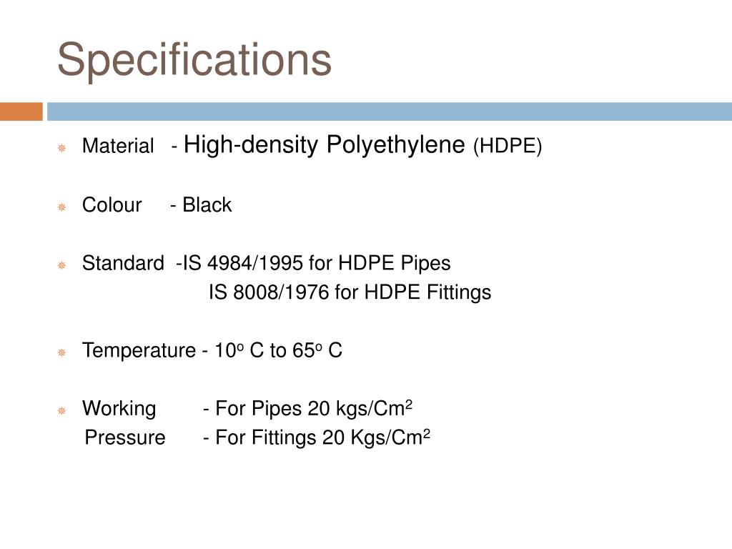 Specifications • Material - High-density Polyethylene (HDPE) • Colour - Black • Standard -IS 4984/1995 for HDPE Pipes IS 8008/1976 for HDPE Fittings • Temperature - 10o C to 65o C • Working - For Pipes 20 kgs/Cm2 Pressure - For Fittings 20 Kgs/Cm2