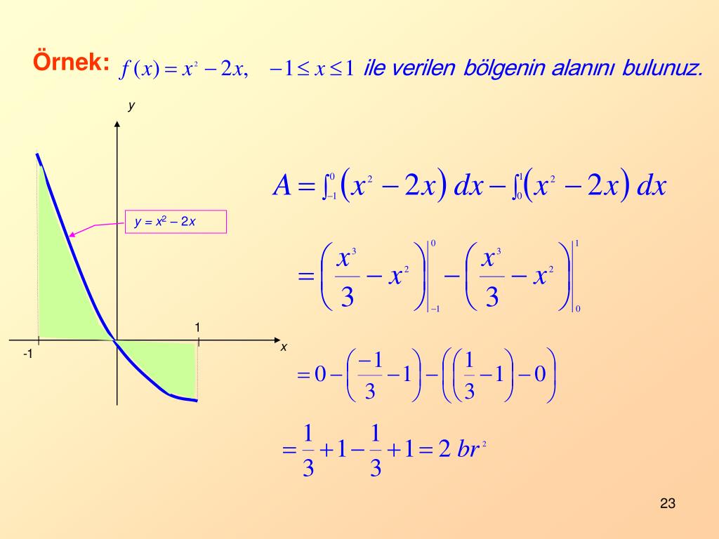 Örnek: y = x2- 1 parabolü ve ile y = 2x-1 doğrusu tarafından sınırlanan bölgenin alanını hesaplayınız Çözüm: Önce alanı sorulan bölgeyi çizelim. Bu bölge hem x eksenine hem de y eksenine göre düzgündür x eksenine göre düzgün alalım.