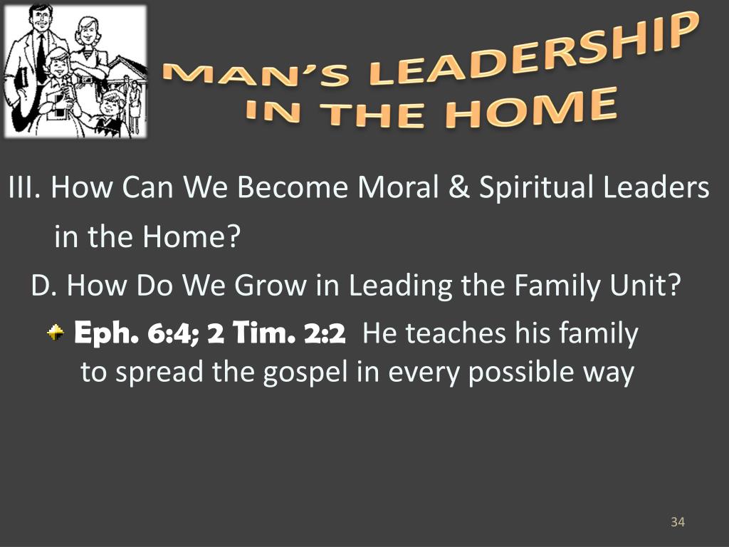 MAN’S LEADERSHIP IN THE HOME III. How Can We Become Moral & Spiritual Leaders in the Home? D. How Do We Grow in Leading the Family Unit? • Eph. 6:4; 2 Tim. 2:2 He teaches his family to spread the gospel in every possible way
