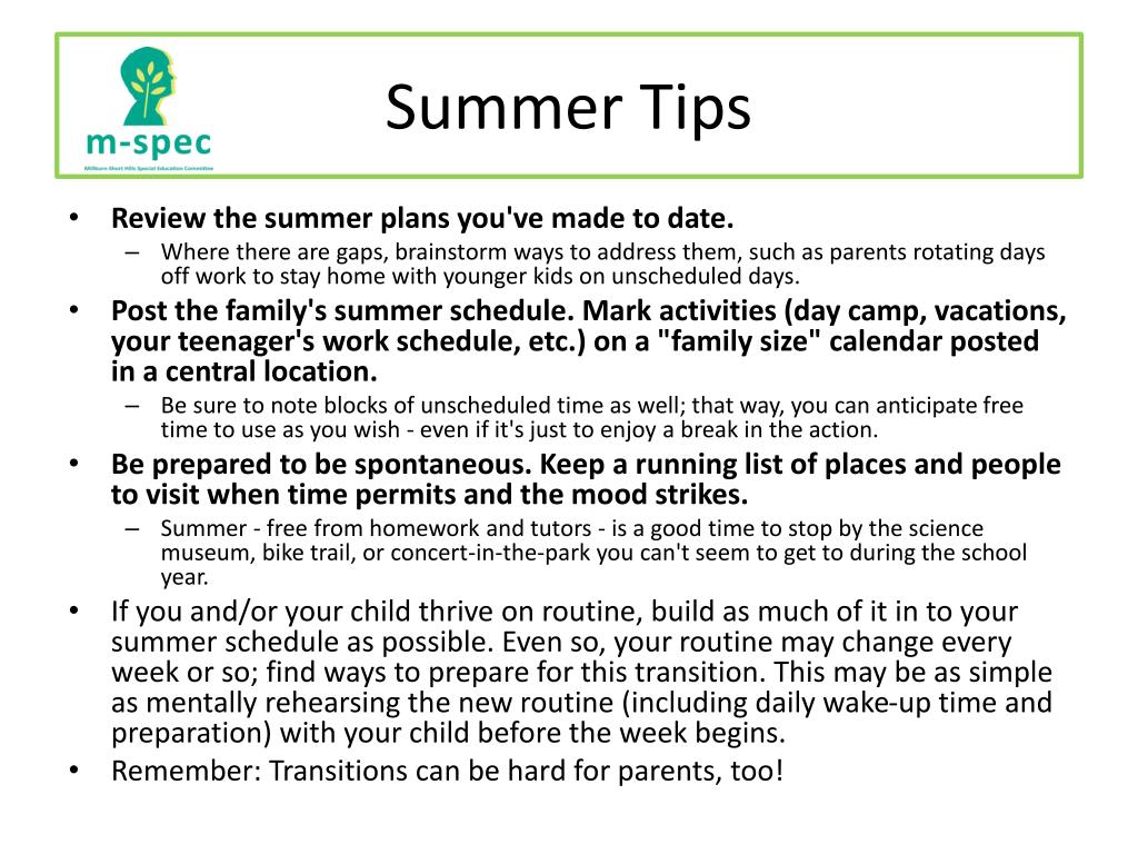 Summer Tips • Summer “learning loss” or “the summer slide” is what teachers call the regression in skills which takes place in the time between the end of one school year and the beginning of the next. • Research shows that special education students, on average, experience a more significant skill loss than typical students. • With some planning and effort it is possible to forestall this skill loss and set up your child for a successful return to school in September. • Some tips for keeping your child’s skills sharp over the summer: From Friendship Circle website