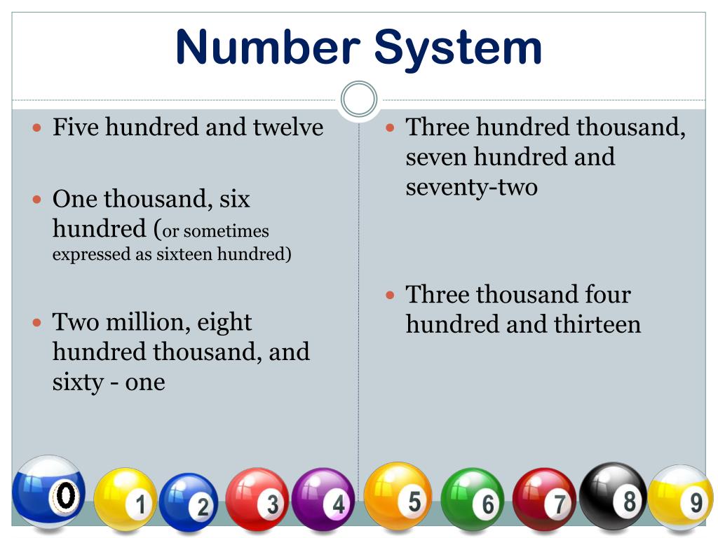 Number System • Five hundred and twelve 512 • One thousand, six hundred (or sometimes expressed as sixteen hundred) 1,600 • Two million, eight hundred thousand, and sixty – one 2,800,061 • Three hundred thousand, seven hundred and seventy-two 300,772 • Three thousand four hundred and thirteen 3,413