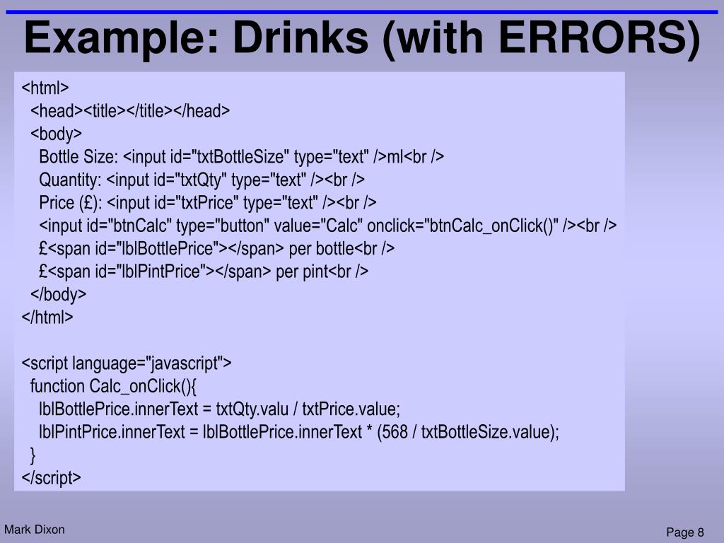 Example: Drinks (with ERRORS) <html> <head><title></title></head> <body> Bottle Size: <input id="txtBottleSize" type="text" />ml<br /> Quantity: <input id="txtQty" type="text" /><br /> Price (£): <input id="txtPrice" type="text" /><br /> <input id="btnCalc" type="button" value="Calc" onclick="btnCalc_onClick()" /><br /> £<span id="lblBottlePrice"></span> per bottle<br /> £<span id="lblPintPrice"></span> per pint<br /> </body> </html> <script language="javascript"> function Calc_onClick(){ lblBottlePrice.innerText = txtQty.valu / txtPrice.value; lblPintPrice.innerText = lblBottlePrice.innerText * (568 / txtBottleSize.value); } </script>