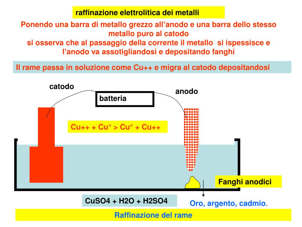 raffinazione elettrolitica dei metalli Ponendo una barra di metallo grezzo all’anodo e una barra dello stesso metallo puro al catodosi osserva che al passaggio della corrente il metallo si ispessisce e l’anodo va assotigliandosi e depositando fanghi Il rame passa in soluzione come Cu++ e migra al catodo depositandosi catodo anodo batteria Cu++ + Cu° > Cu° + Cu++ Fanghi anodici CuSO4 + H2O + H2SO4 Oro, argento, cadmio. Raffinazione del rame