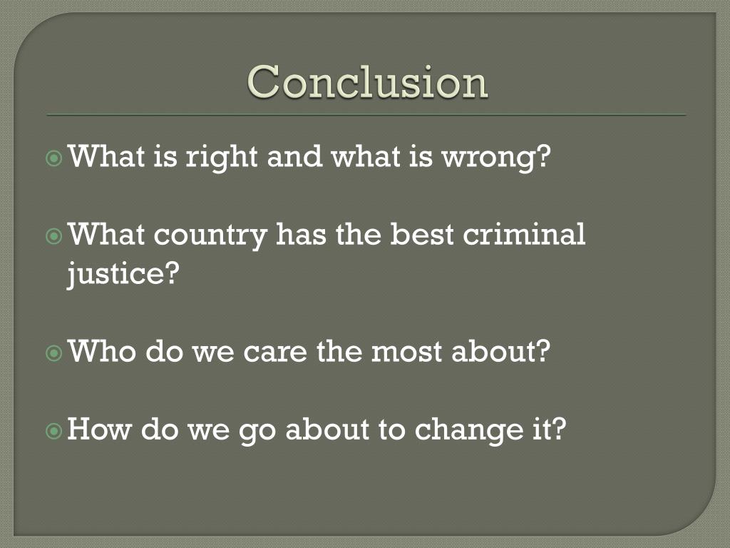 Conclusion What is right and what is wrong? What country has the best criminal justice? Who do we care the most about? How do we go about to change it?