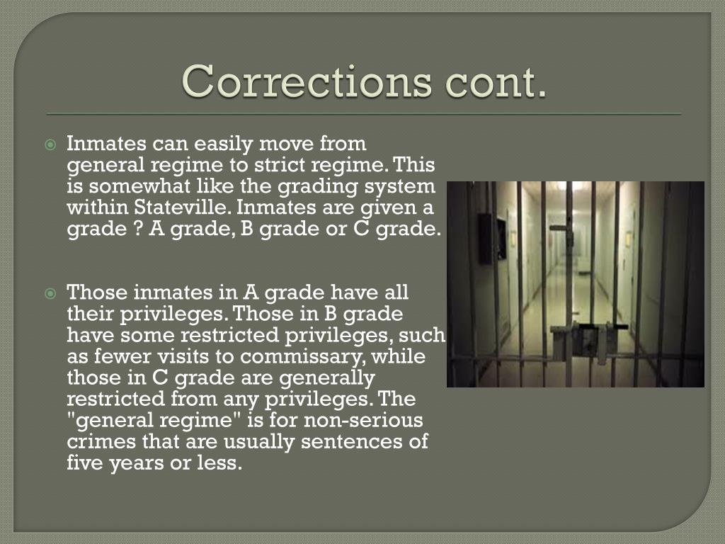 Corrections cont. Inmates can easily move from general regime to strict regime. This is somewhat like the grading system within Stateville. Inmates are given a grade ? A grade, B grade or C grade. Those inmates in A grade have all their privileges. Those in B grade have some restricted privileges, such as fewer visits to commissary, while those in C grade are generally restricted from any privileges. The "general regime" is for non-serious crimes that are usually sentences of five years or less.