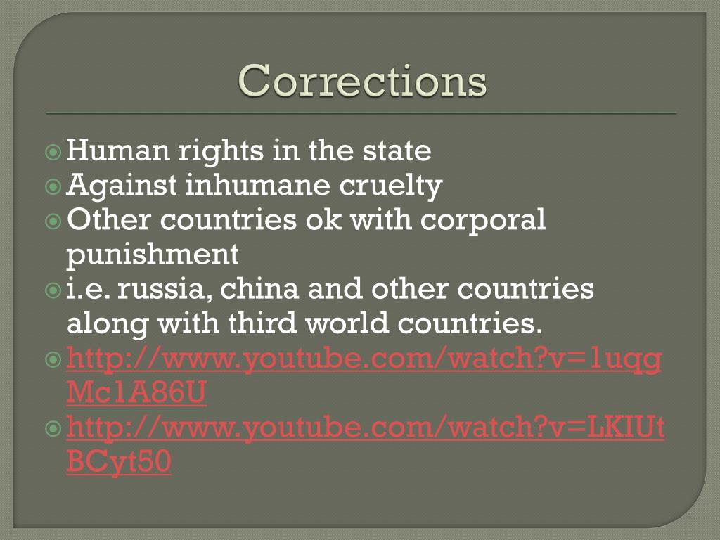Corrections Human rights in the state Against inhumane cruelty Other countries ok with corporal punishment i.e. russia, china and other countries along with third world countries. http://www.youtube.com/watch?v=1uqgMc1A86U http://www.youtube.com/watch?v=LKIUtBCyt50