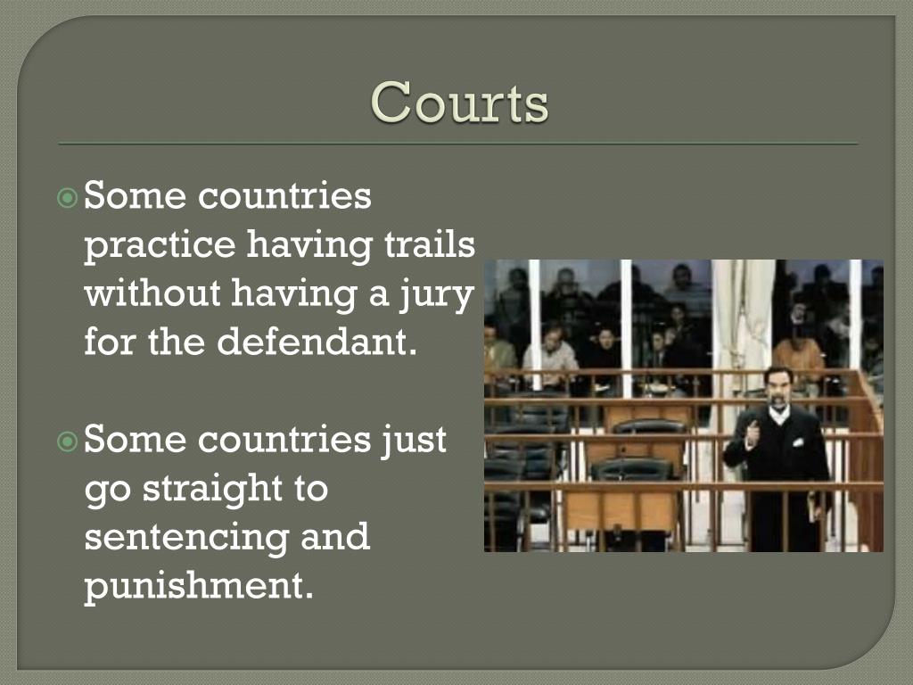 Courts Some countries practice having trails without having a jury for the defendant. Some countries just go straight to sentencing and punishment.