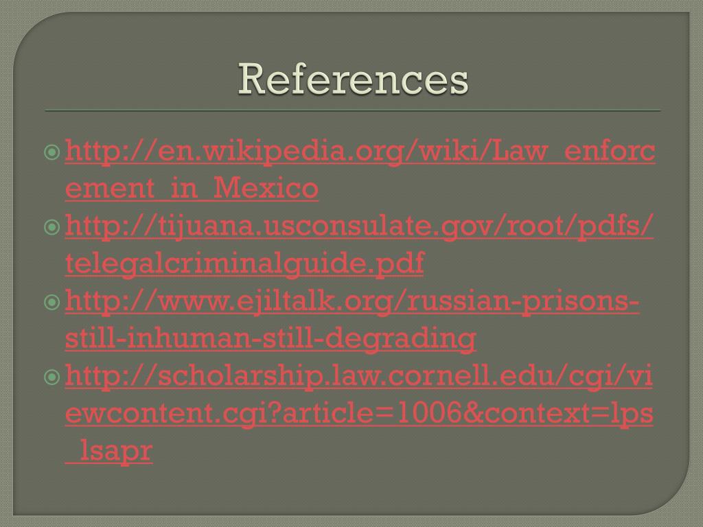 References http://en.wikipedia.org/wiki/Law_enforcement_in_Mexico http://tijuana.usconsulate.gov/root/pdfs/telegalcriminalguide.pdf http://www.ejiltalk.org/russian-prisons-still-inhuman-still-degrading http://scholarship.law.cornell.edu/cgi/viewcontent.cgi?article=1006&context=lps_lsapr