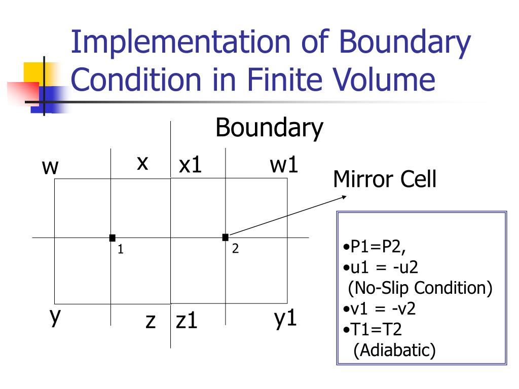 x x1 w1 w Mirror Cell . . i,j+1/2 2 1 y y1 z z1 Implementation of Boundary Condition in Finite Volume Boundary • P1=P2, • u1 = -u2 • (No-Slip Condition) • v1 = -v2 • T1=T2 • (Adiabatic)