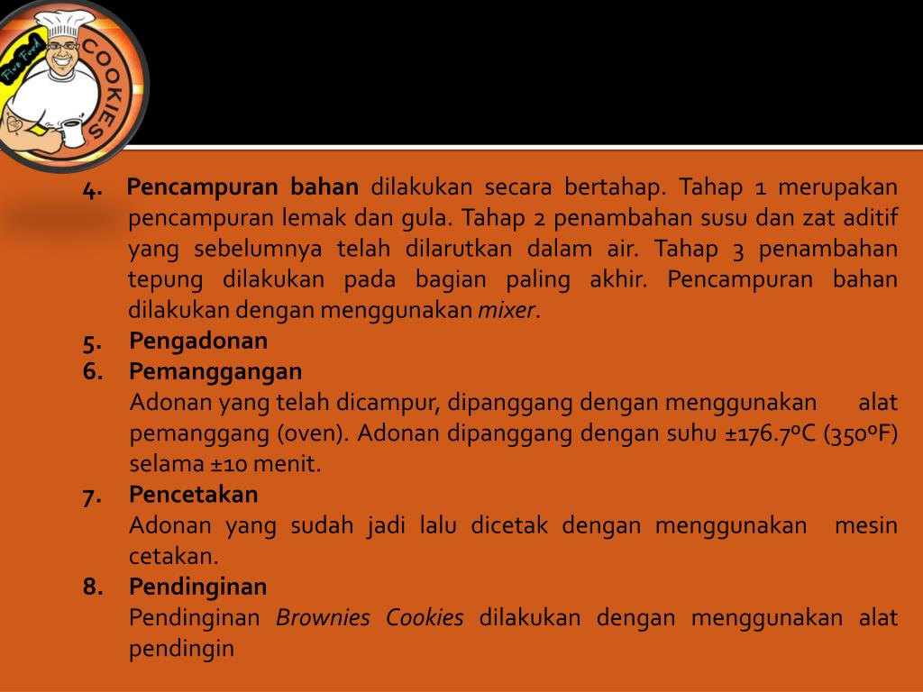 4. Pencampuranbahandilakukansecarabertahap. Tahap 1 merupakanpencampuranlemakdangula. Tahap 2 penambahansusudanzataditif yang sebelumnyatelahdilarutkandalam air. Tahap 3 penambahantepungdilakukanpadabagian paling akhir. Pencampuranbahandilakukandenganmenggunakanmixer. 5. Pengadonan 6. Pemanggangan Adonan yang telahdicampur, dipanggangdenganmenggunakanalatpemanggang (oven). Adonandipanggangdengansuhu ±176.7ºC (350ºF) selama ±10 menit. 7. Pencetakan Adonan yang sudahjadilaludicetakdenganmenggunakanmesincetakan. 8. Pendinginan PendinginanBrownies Cookies dilakukandenganmenggunakanalatpendingin