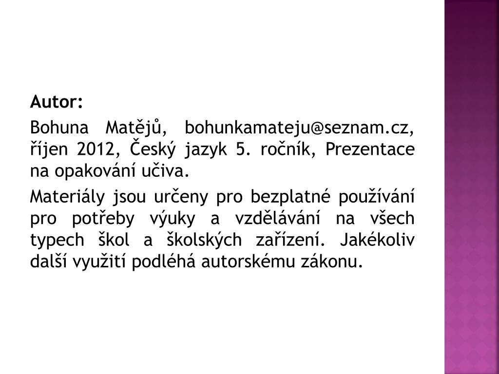 Autor: Bohuna Matějů, bohunkamateju@seznam.cz, říjen 2012, Český jazyk 5. ročník, Prezentace na opakování učiva. Materiály jsou určeny pro bezplatné používání pro potřeby výuky a vzdělávání na všech typech škol a školských zařízení. Jakékoliv další využití podléhá autorskému zákonu.
