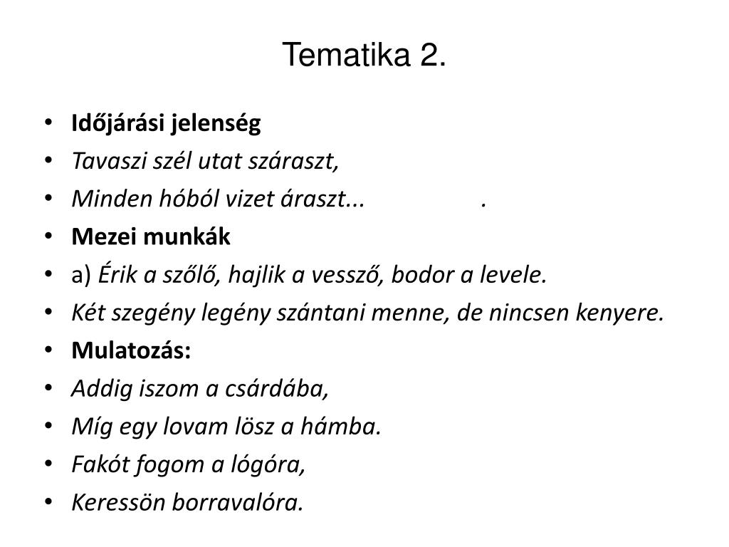 Tematika 2. • Időjárási jelenség • Tavaszi szél utat száraszt, • Minden hóból vizet áraszt... . • Mezei munkák • a) Érik a szőlő, hajlik a vessző, bodor a levele. • Két szegény legény szántani menne, de nincsen kenyere. • Mulatozás: • Addig iszom a csárdába, • Míg egy lovam lösz a hámba. • Fakót fogom a lógóra, • Keressön borravalóra.