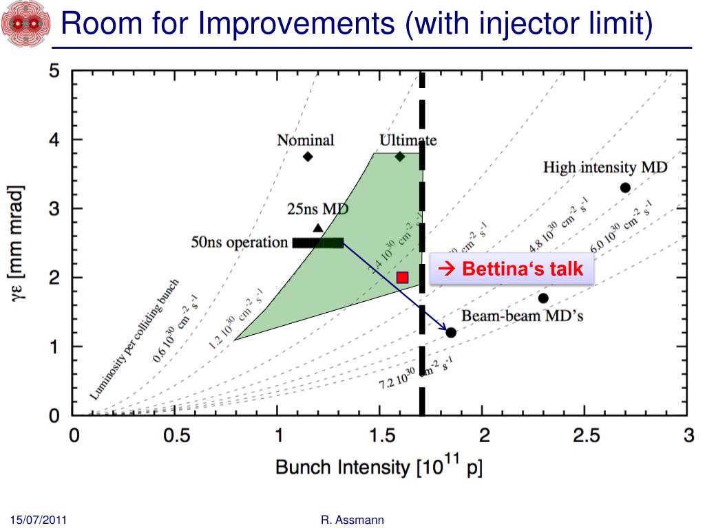 RoomforImprovements (LHC only) Most efficient in viewoflimits: Increasebunchintensityforthe same emittance. Gainoffactor 4 ispossible! R. Assmann