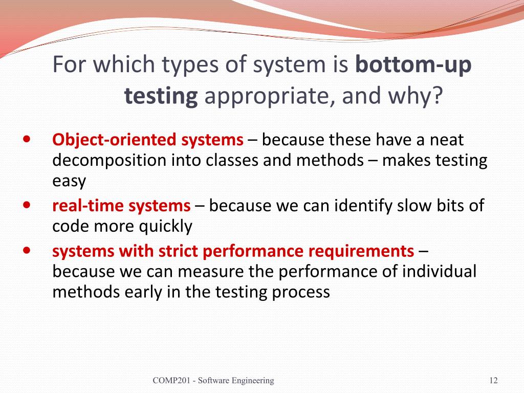 For which types of system is bottom-up testing appropriate, and why? • Object-oriented systems– because these have a neat decomposition into classes and methods – makes testing easy • real-time systems– because we can identify slow bits of code more quickly • systems with strict performance requirements– because we can measure the performance of individual methods early in the testing process COMP201 - Software Engineering