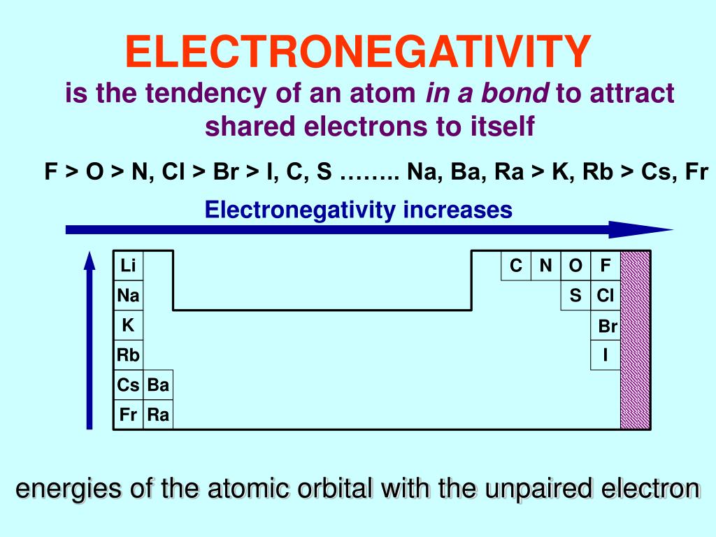ELECTRONEGATIVITY Li C N O F Na S Cl K Br Rb I Cs Ba Fr Ra is the tendency of an atom in a bond to attract shared electrons to itself F > O > N, Cl > Br > I, C, S …….. Na, Ba, Ra > K, Rb > Cs, Fr Electronegativity increases energies of the atomic orbital with the unpaired electron