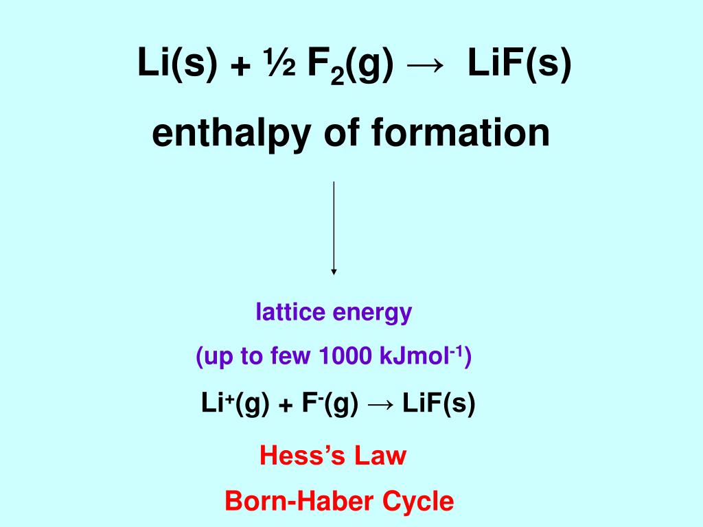 Li(s) + ½ F2(g) → LiF(s) enthalpy of formation lattice energy (up to few 1000 kJmol-1) Li+(g) + F-(g) → LiF(s) Hess’s Law Born-Haber Cycle