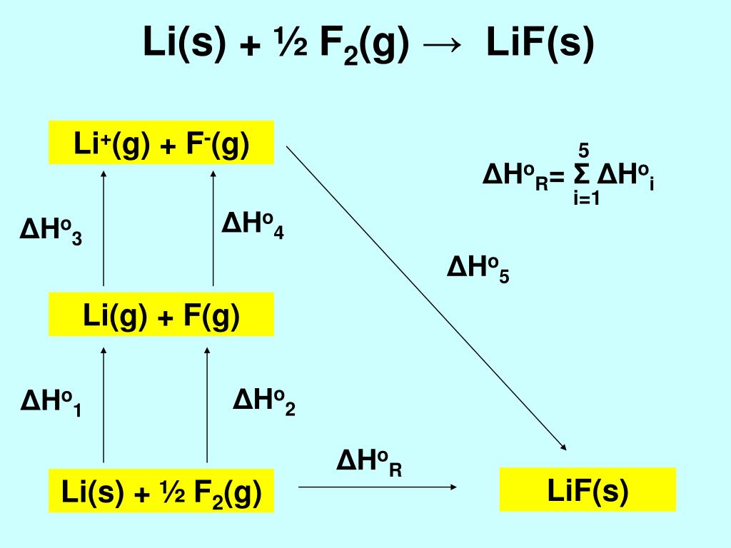 Li(s) + ½ F2(g) → LiF(s) Li+(g) + F-(g) 5 ΔHoR= ΣΔHoi i=1 ΔHo4 ΔHo3 ΔHo5 Li(g) + F(g) ΔHo2 ΔHo1 ΔHoR LiF(s) Li(s) + ½ F2(g)