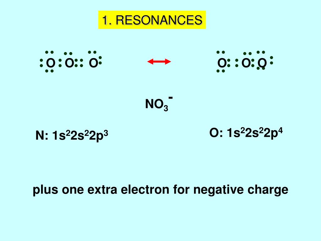 O O O O O O 1. RESONANCES NO3- O: 1s22s22p4 N: 1s22s22p3 plus one extra electron for negative charge