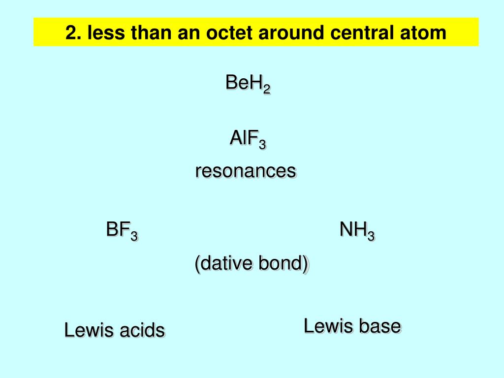2. less than an octet around central atom BeH2 AlF3 resonances BF3 NH3 (dative bond) Lewis base Lewis acids