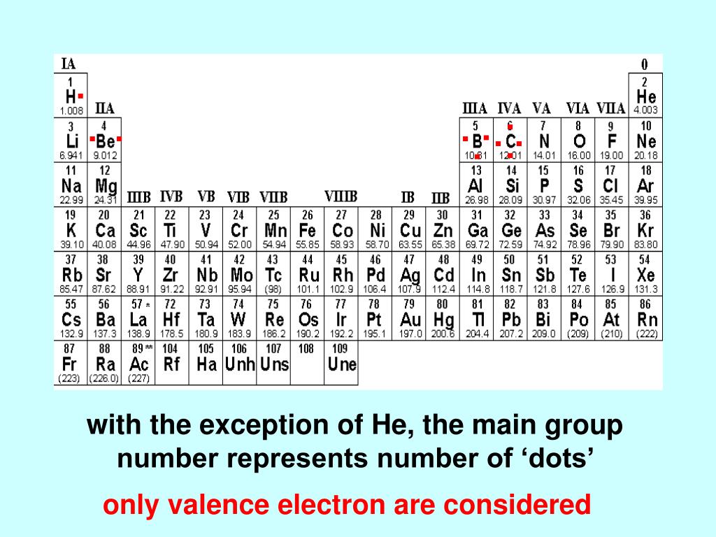 . . . . . . . . . . with the exception of He, the main group number represents number of ‘dots’ only valence electron are considered