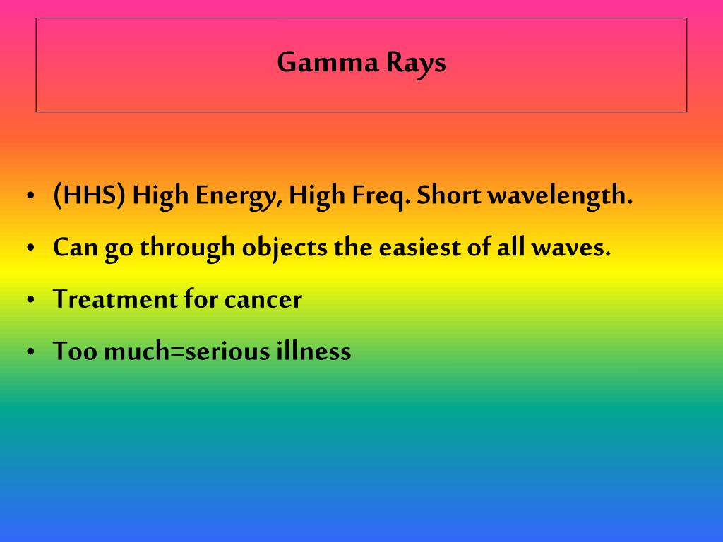Gamma Rays • (HHS) High Energy, High Freq. Short wavelength. • Can go through objects the easiest of all waves. • Treatment for cancer • Too much=serious illness