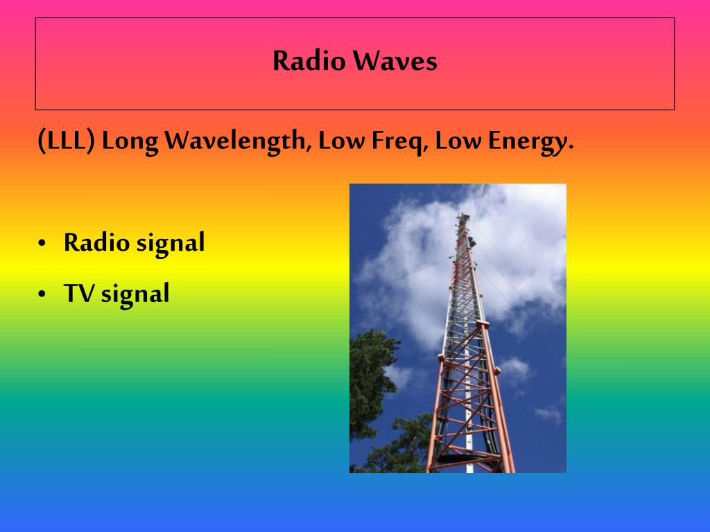 Radio Waves (LLL) Long Wavelength, Low Freq, Low Energy. • Radio signal • TV signal