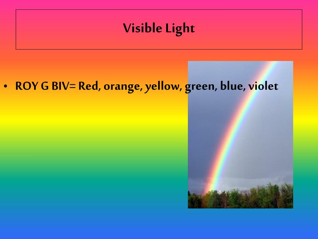 ROY G BIV= Red, orange, yellow, green, blue, violet Visible Light