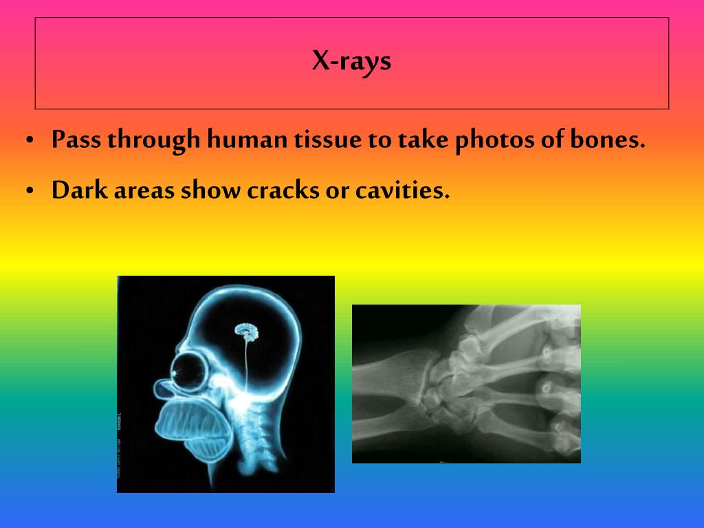 X-rays • Pass through human tissue to take photos of bones. • Dark areas show cracks or cavities.