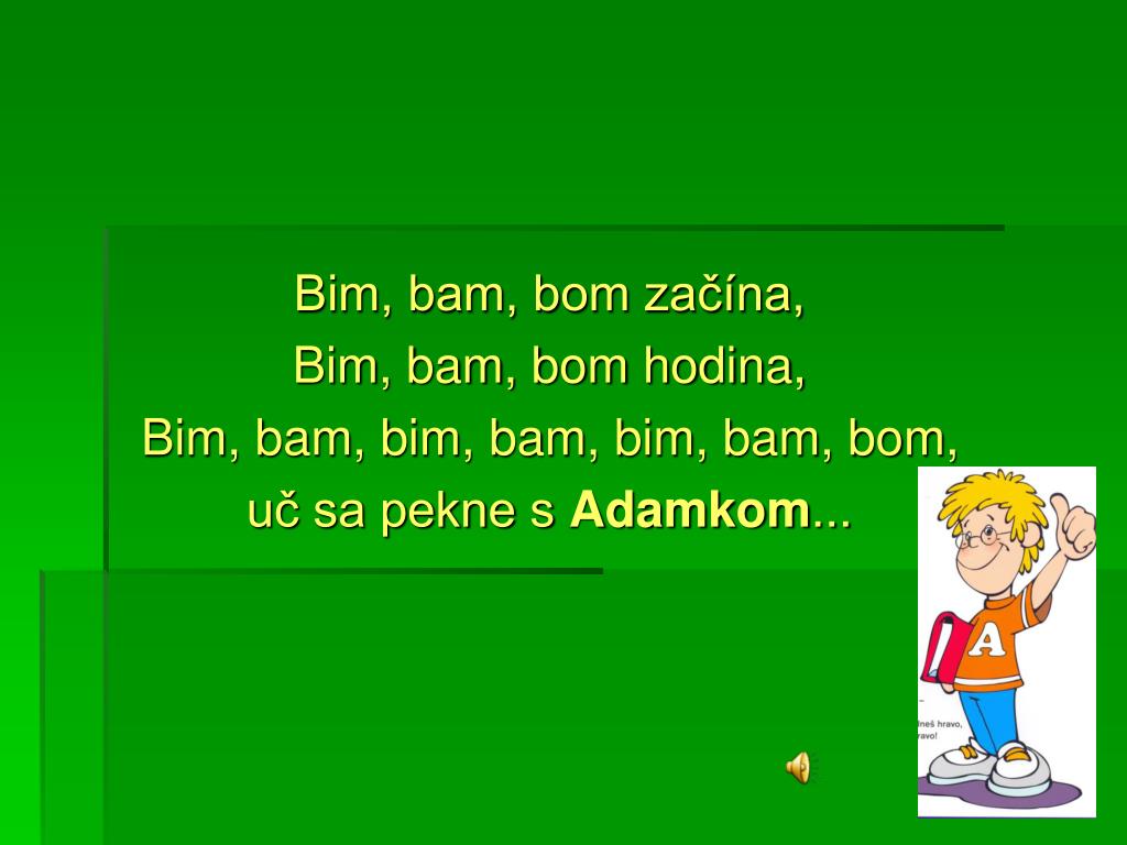 Bim, bam, bom začína, Bim, bam, bom hodina, Bim, bam, bim, bam, bim, bam, bom, uč sa pekne s Adamkom...